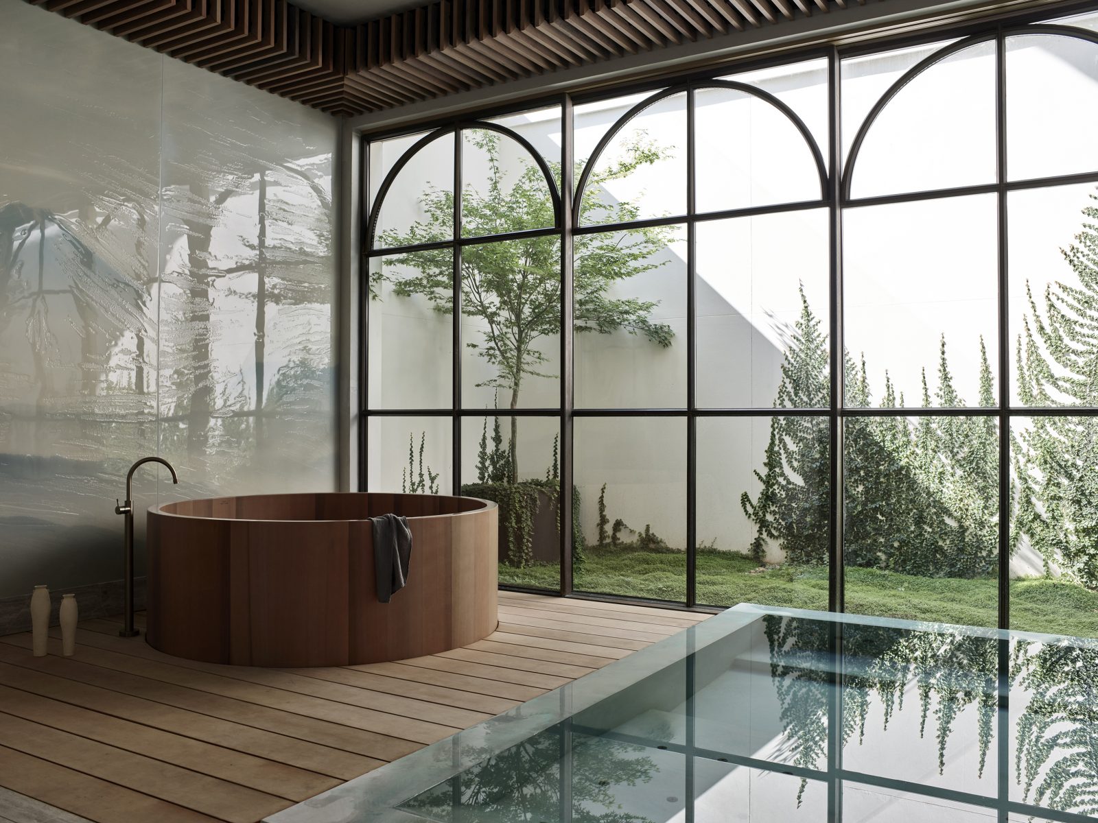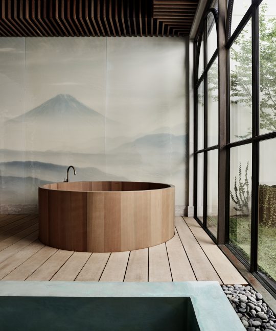 The large cedar plunge pool features a clean, cylindrical form that highlights the timber’s natural tone and grain. Positioned on timber decking beside full-height windows, it is complemented by a serene mural backdrop, creating a tranquil, spa-like atmosphere that blends warmth, minimalism, and a strong connection to nature.