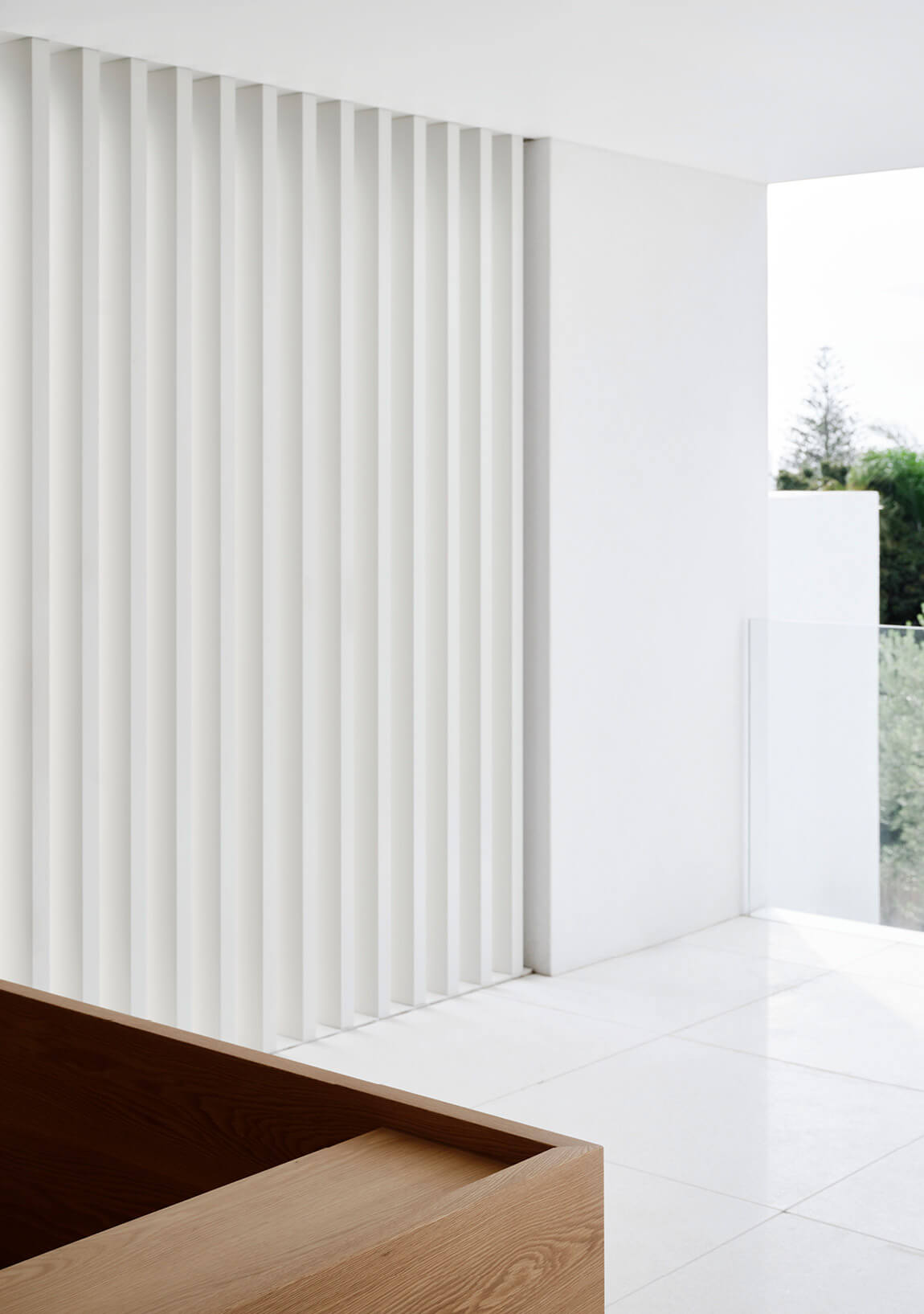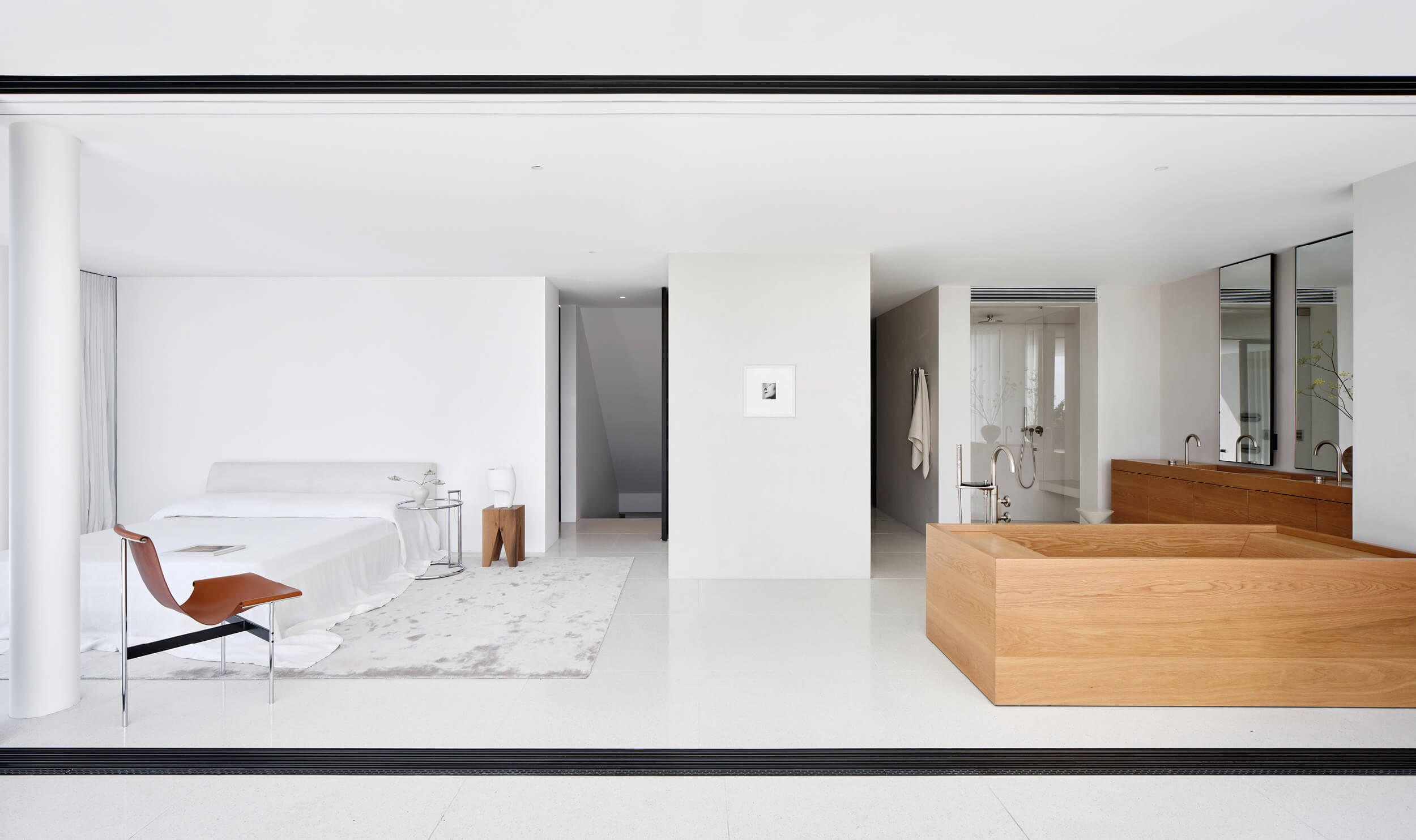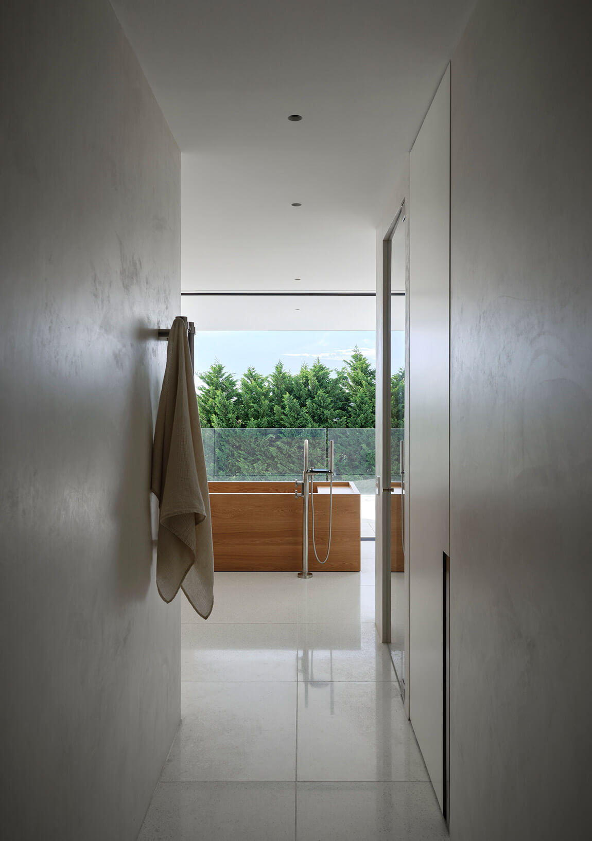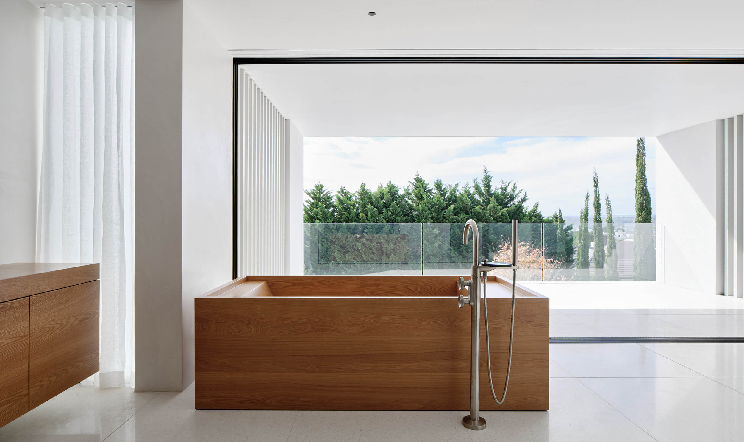 The Bellevue Hill House by Mathieson Architects features a custom solid oak bathtub and matching vanity, both designed as refined, sculptural elements within a minimalist interior. The bathtub is rectilinear and freestanding, emphasizing clean lines and precise joinery that highlight the natural grain and warmth of the timber. The floating vanity mirrors this aesthetic with seamless oak cabinetry and integrated basins, reinforcing a sense of calm and order. Together, these pieces contrast subtly against the white terrazzo flooring and crisp architectural surfaces, embodying Mathieson Architects’ commitment to material purity and understated luxury.